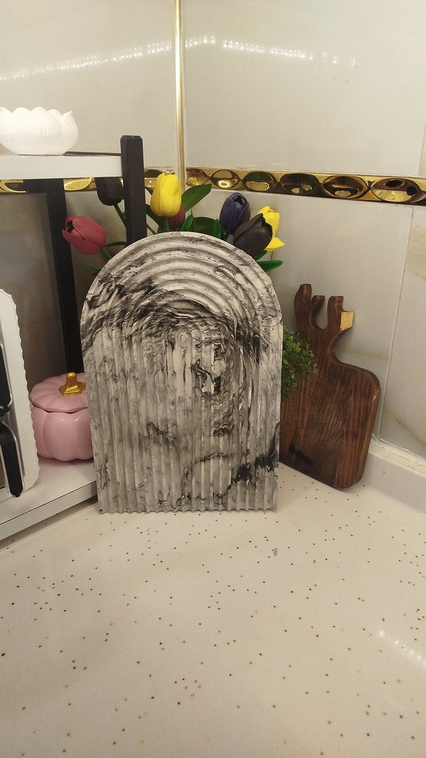 Gri renkli, kabartmalı kemer şeklinde tasarıma sahip dekoratif vazo, modern ve şık bir görünüm sunar.