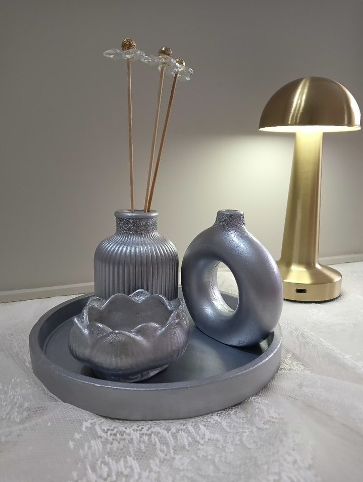 Gri renkte, yuvarlak vazolar ve lotus şeklinde mumluklar ile uyumlu tepsi içeren dekoratif set. ️4lü set fiyatı.. istenen renkte hazırlanır✨