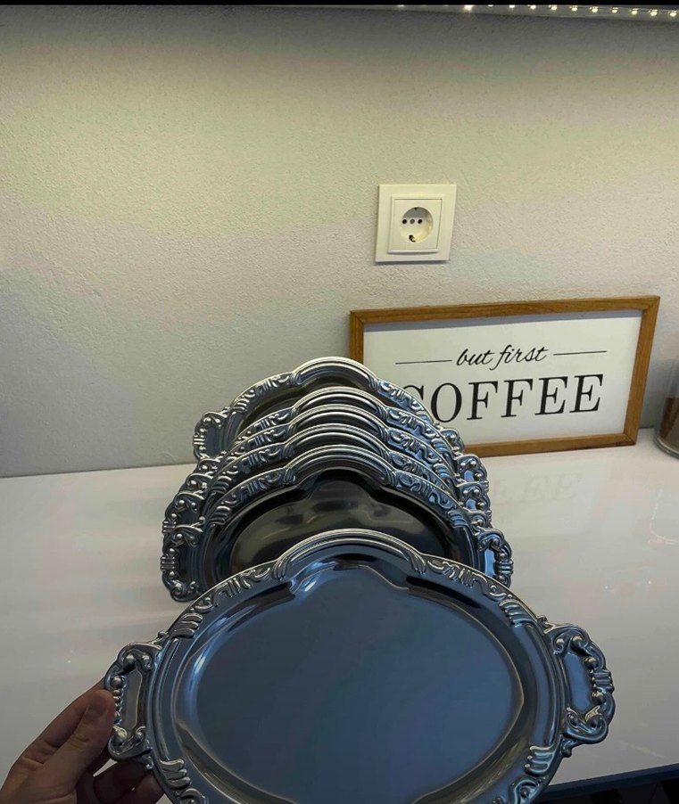 El işçiliği detaylı kulplara sahip gri dekoratif tepsi seti, mutfakta servis veya sunum için uygundur. Koyu ve şık bir görünüme sahiptir. ☕