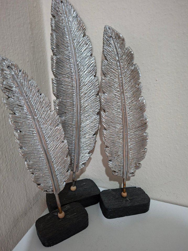 Siyah tabanlı, gri dekoratif tüy figürlerinden oluşan üçlü set, mekana şık bir dokunuş katıyor.
