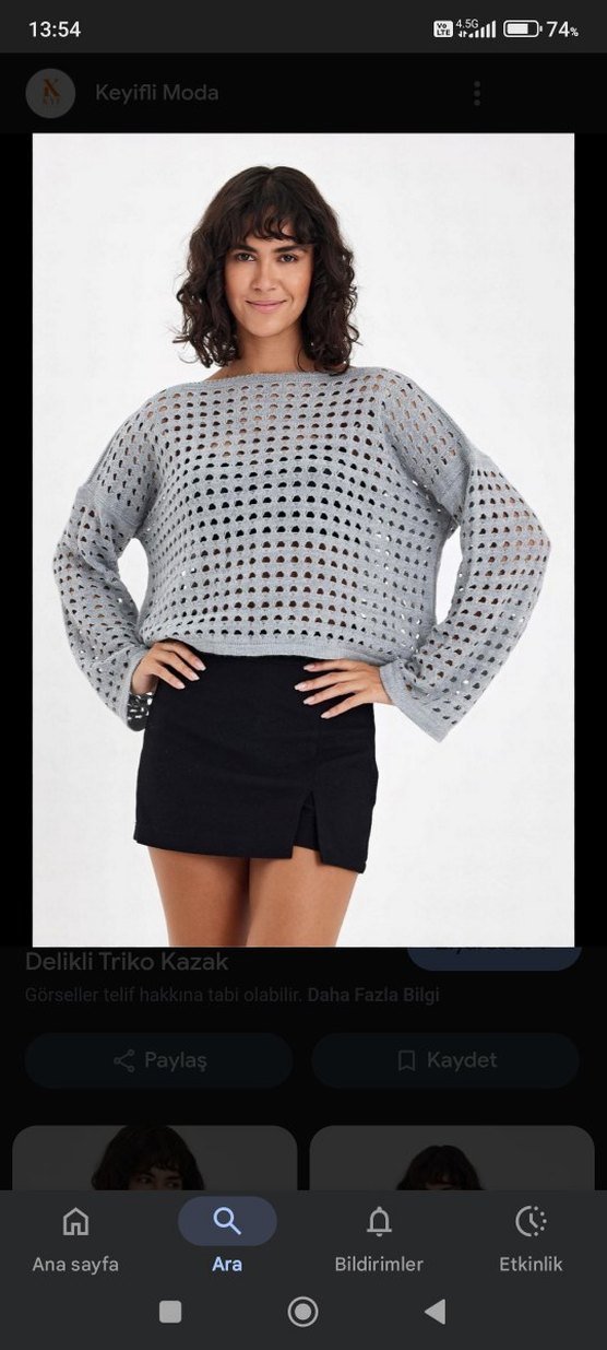 Gri renkli, delikli triko dokuma, kısa boy, bol kesim kadın kazak. Uzun kollu ve yuvarlak yakalı, günlük sokak stiline uygun. Kalın askılı atlet ile birlikte takım saks mavisi rengi de var .s m bedene uygun