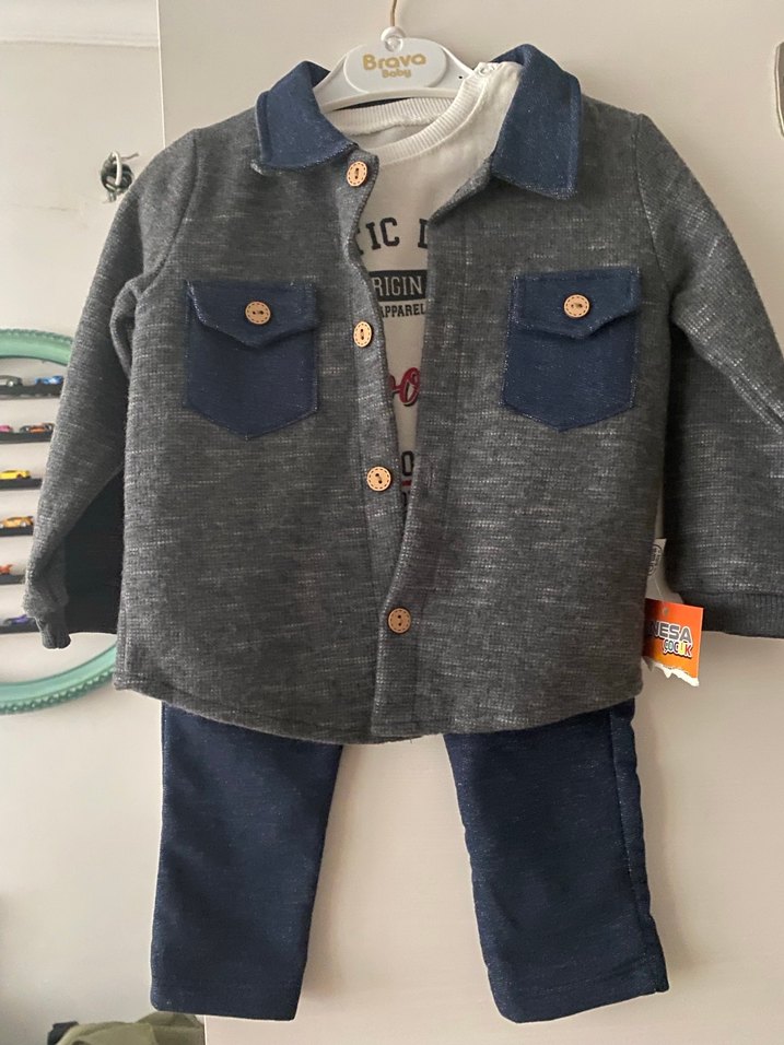 Düğmeli, gri denim uzun kollu ceket ve lacivert pantolondan oluşan bebek erkek takım. Marka temsili 3 lü takımdır