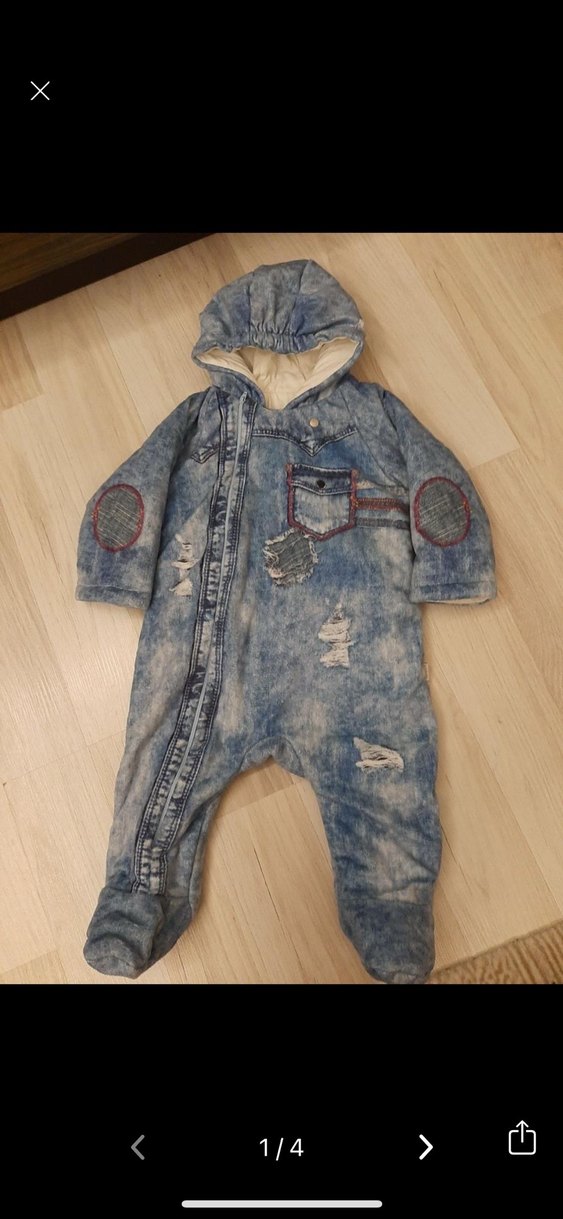 Gri denim kumaştan yapılmış, kürklü kapüşonlu ve yırtık detaylı sokak stili bebek tulumu. Sıcak tutar ve desensizdir. ❄️