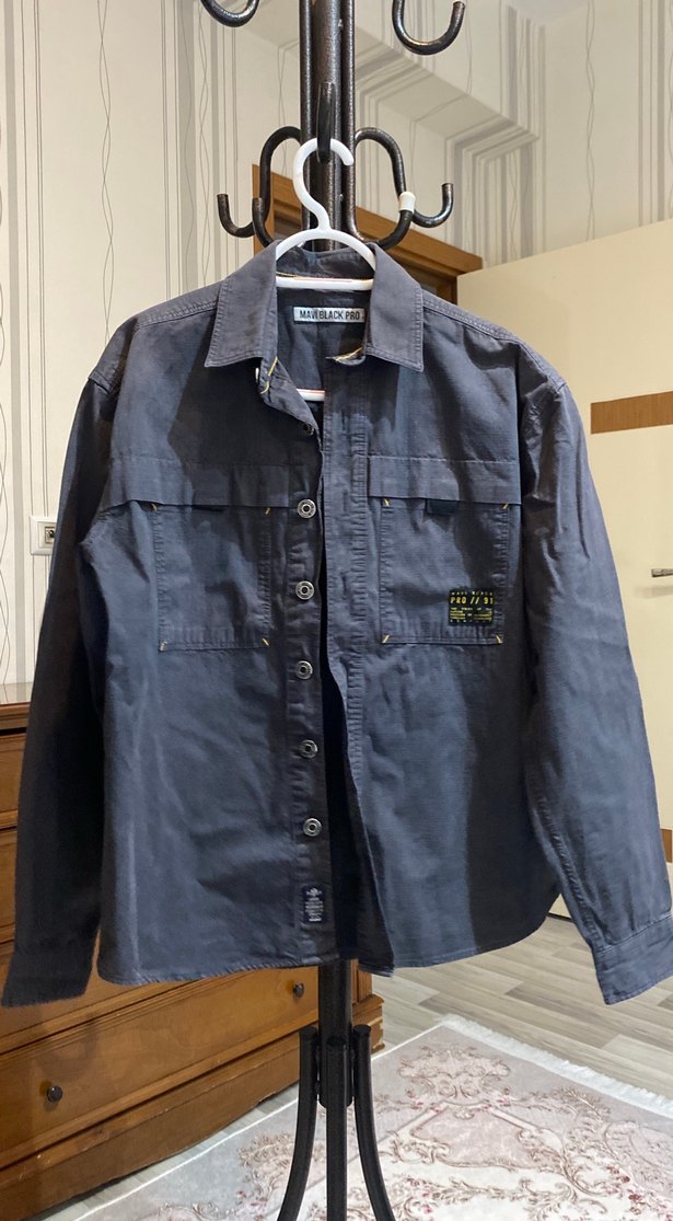 Düğmeli, gri renkte denim kumaştan yapılmış, uzun kollu ve normal boyda erkek gömleği. Notched lapel yakaya sahip, rahat kesim ve günlük sokak stili için uygun. çok oversize m l biri de giyebilir