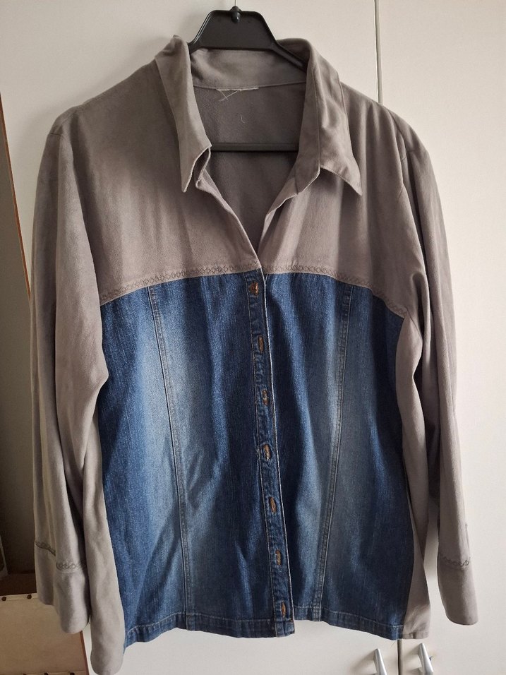 Gri ve denim kumaştan yapılmış, düğmeli ve yakalı uzun kollu kadın gömleği. Rahat kesimi ve midi boyuyla gündelik kullanıma uygundur.