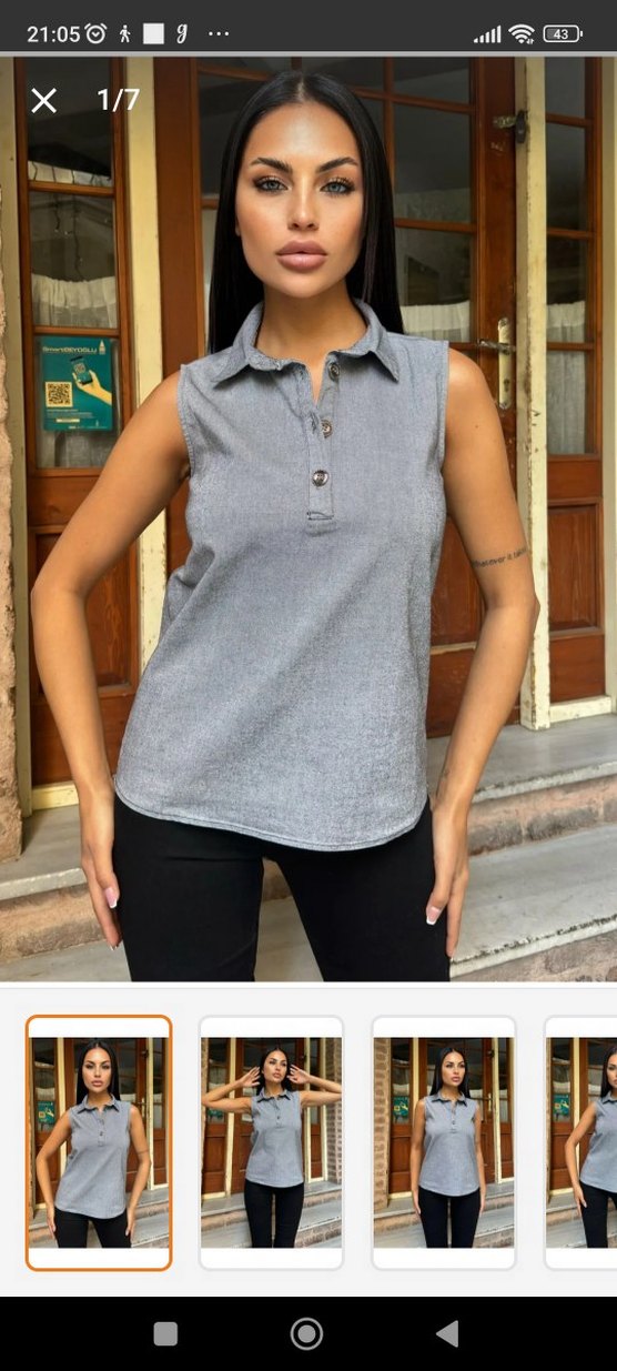 Kolsuz, düğmeli önü ve yakalı gri denim gömlek, rahat kesimi ve midi boyuyla günlük sokak stiline uygun.