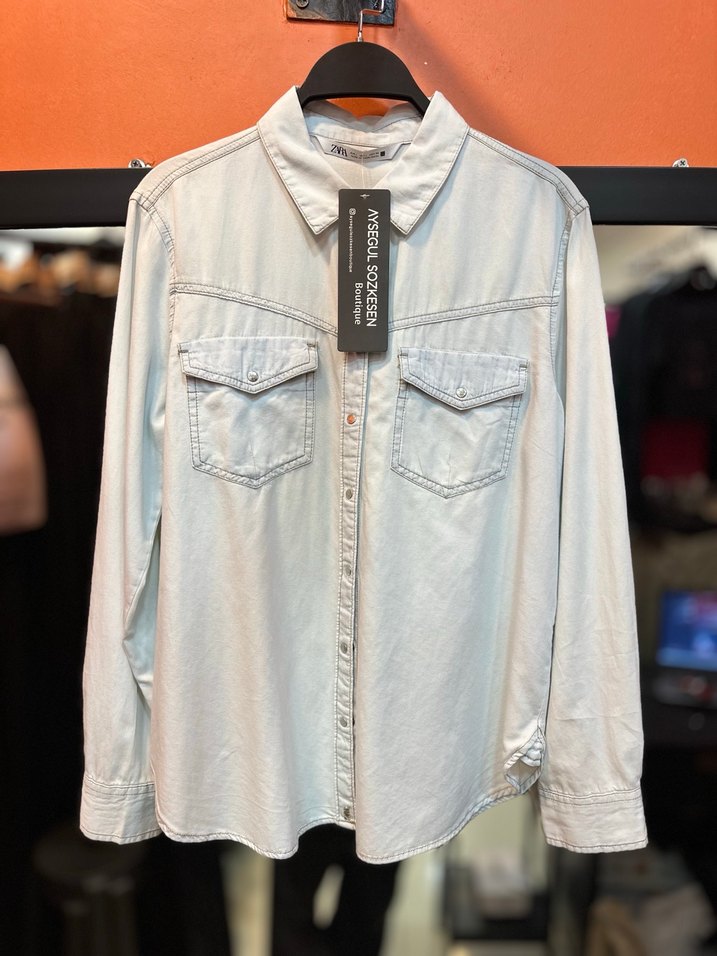 Gri denim kumaştan, düğmeli ve yakalı uzun kollu gömlek. Salaş kesimi ve iki ön cep detayı ile günlük rahat kullanıma uygun.