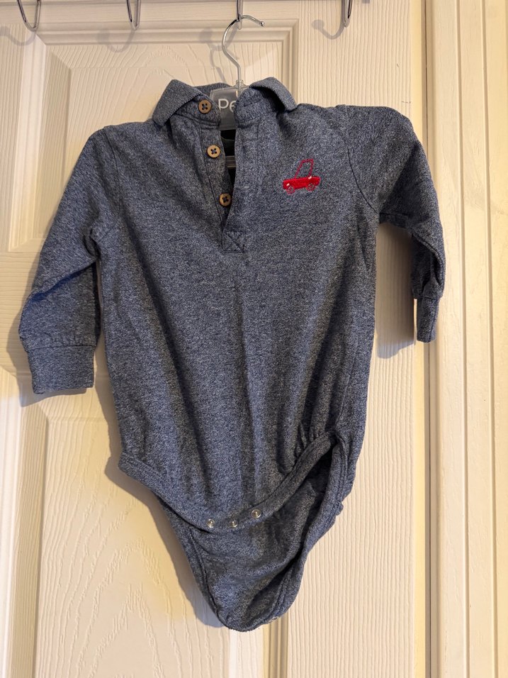 Gri denim kumaştan yapılmış, uzun kollu, düğmeli ve yakalı. Kırmızı araba nakışlı erkek bebek body, sokak tarzı için uygun.