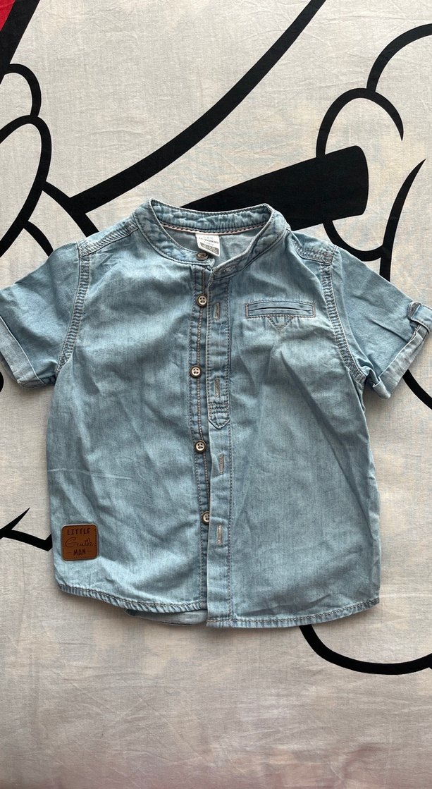 Gri renkte, düğmeli, kısa kollu, yakalı ve bol kesim denim erkek çocuk gömleği. Sokak modası tarzında rahat kullanıma uygun.