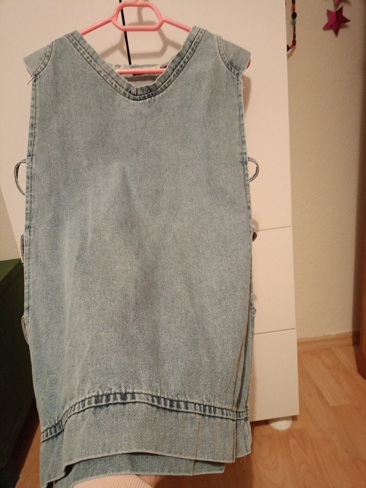mavi renkte denim kumaştan, kolsuz ve bol kesim kadın yeleği. Yuvarlak yaka ve sade, şık bir sokak tarzı sunar.