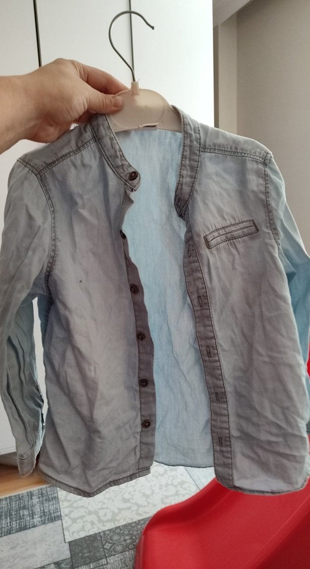 Gri denim kumaştan, uzun kollu, düğmeli ve yakası kesik erkek çocuk gömleği. Salaş kesimiyle rahat bir sokak stili sunar.