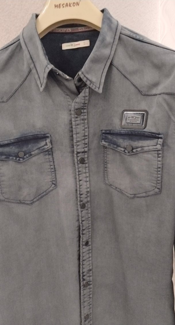 Gri denim erkek gömlek, uzun kollu ve kesimli. Düğmeli cepleri ve baskılı deseniyle günlük rahat sokak stili için uygundur.