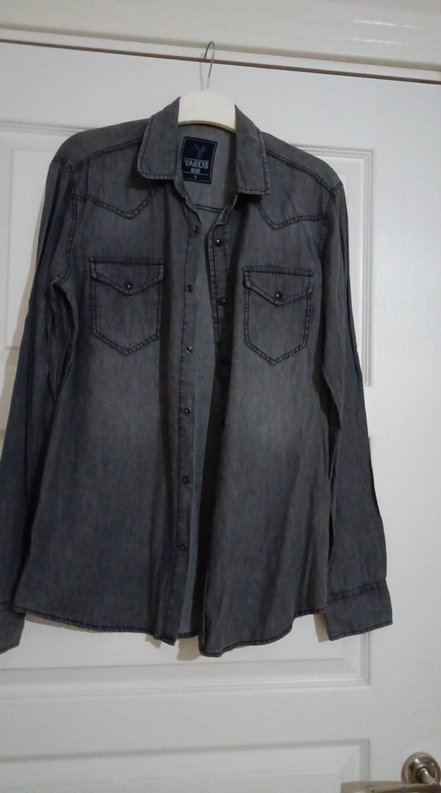 Gri denim erkek gömlek, düğmeli ve uzun kollu olarak tasarlanmıştır. Salaş kesimi ve çıtçıt yakasıyla günlük rahat bir stil sunar.