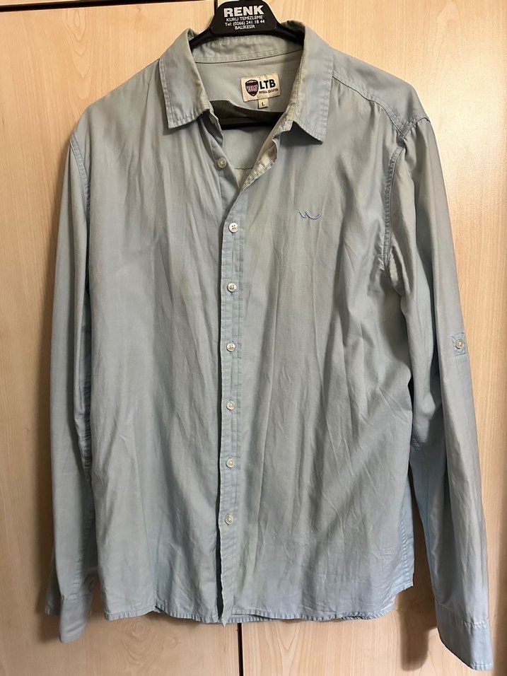 Gri denim kumaştan yapılmış, düğmeli, uzun kollu erkek gömleği. Normal boyda, regular fit kesim ve notched lapel yaka ile günlük kullanıma uygun normcore tarzında.