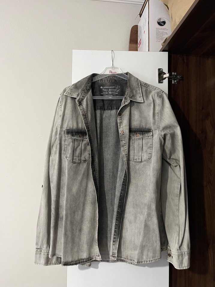 Gri denim erkek gömlek, uzun kollu ve çıtçıtlıdır. Regular fit kesimi ve iki göğüs cebi ile gündelik ve rahat bir tarz sunar.