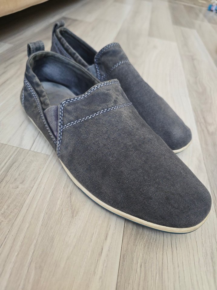 Gri denim kumaştan, desen içermeyen erkek günlük ayakkabıları. Kaymaz tabanlı, rahat ve şık tasarımıyla günlük kullanıma uygundur.