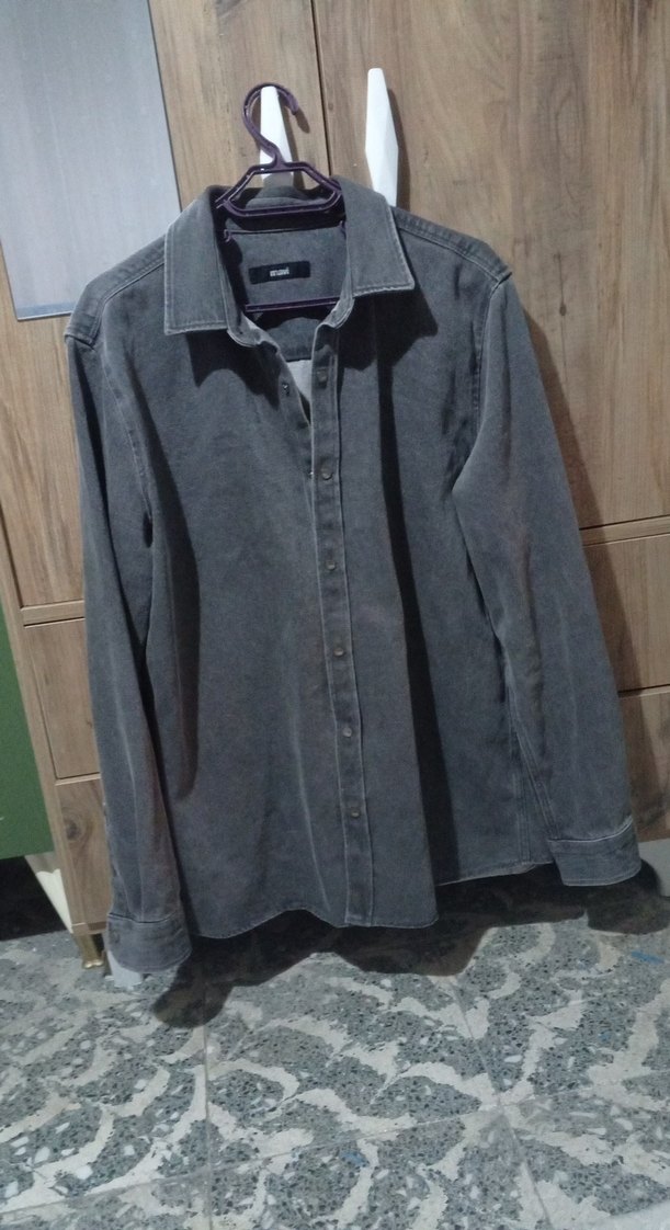 Gri denim erkek kot ceket , yaka detaylı ve düğmeli. Uzun kollu, salaş kesim, günlük sokak stili için uygun.