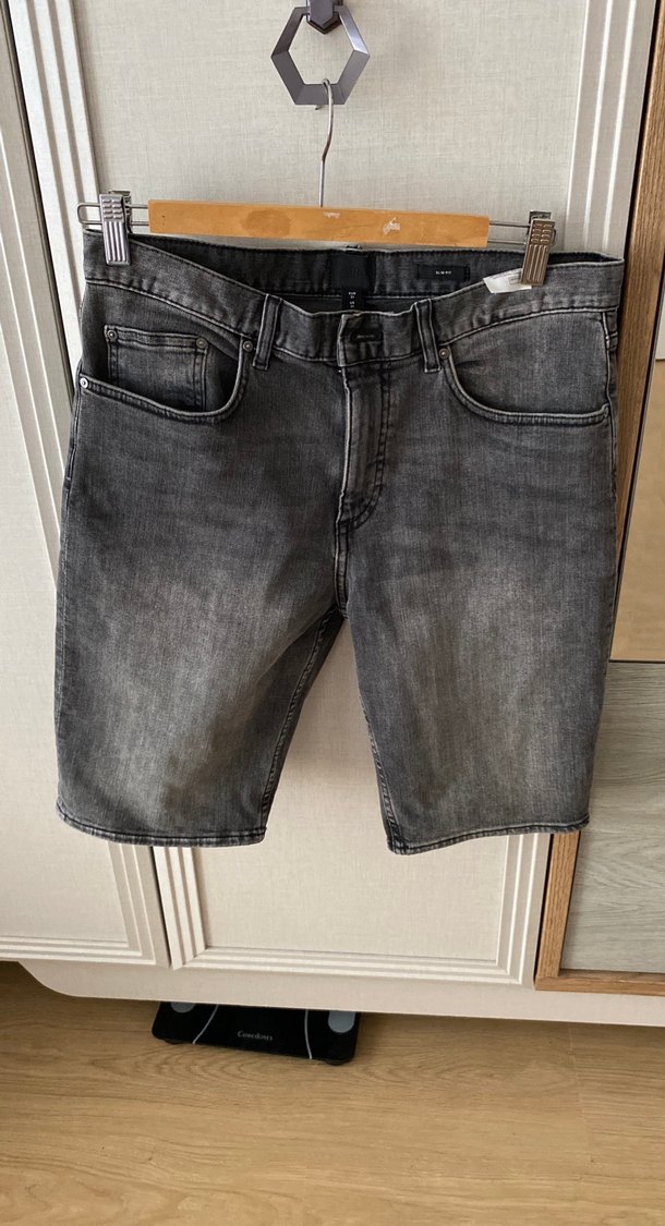 Gri denimden, bol kesim ve tokalı detaylara sahip erkek midi şort. Günlük kullanım için uygun, rahat bir sokak stili.