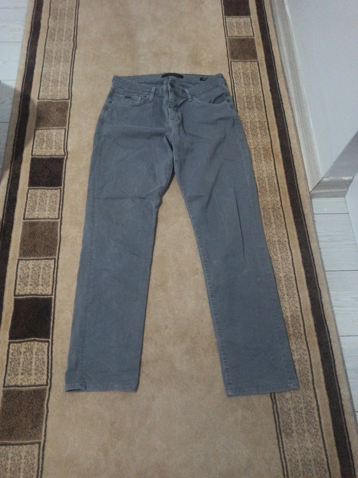 Gri renkte, düz desenli, regular fit kesime sahip erkek denim pantolon. Günlük rahat kullanıma uygun, midi boyda pantolon.