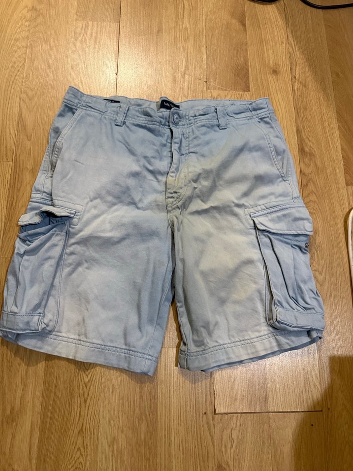 Gri denim kumaştan, bol kesim ve çok cepli kargo şort. Rahat ve şık sokak stili için uygundur.