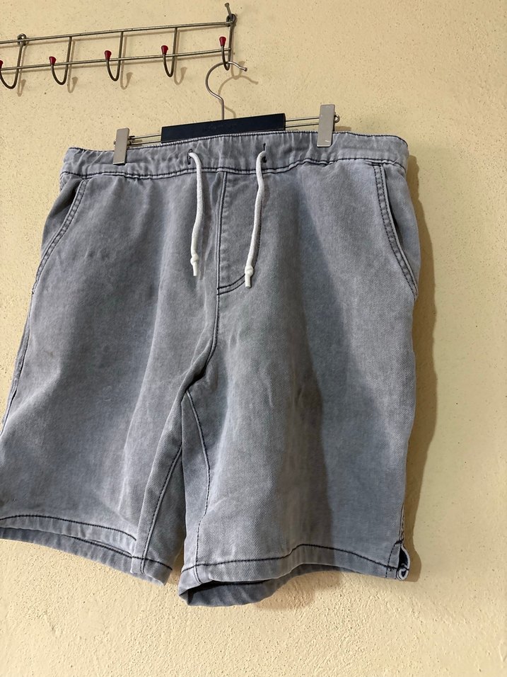 Gri denim erkek şort, rahat kesim ve kısa boy. Yan cepler ve bağcıklı bel detaylarıyla günlük ve şık bir görünüm sunar.