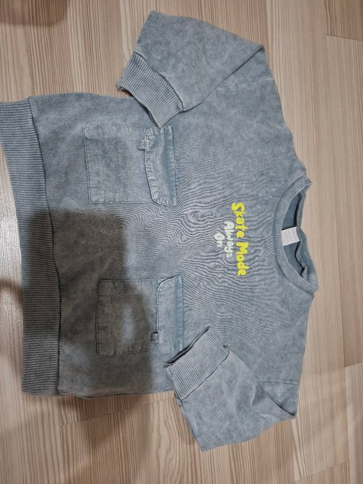 Gri renkli, uzun kollu, düğmeli ve baskılı desenli erkek sweatshirtü. Denim kumaştan, bol kesim ve bisiklet yakalıdır.