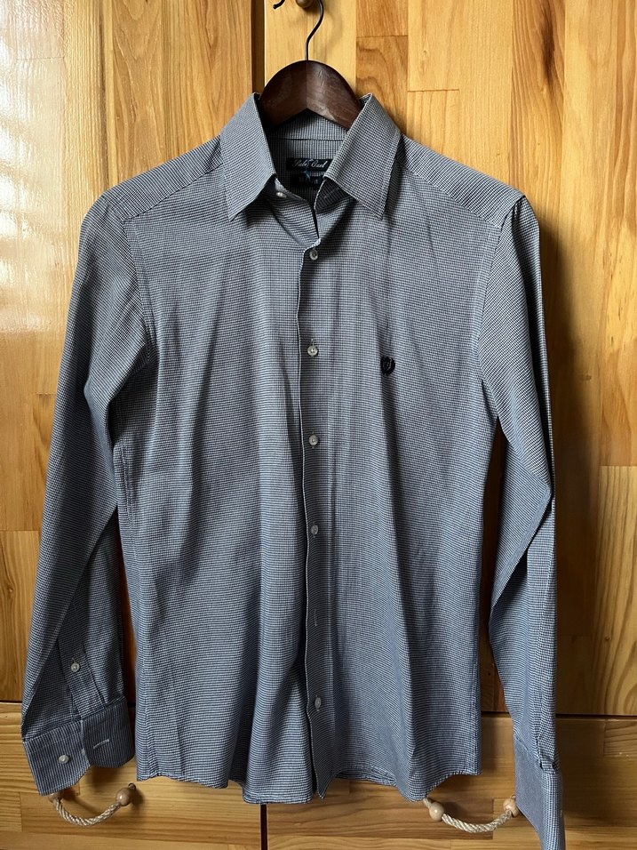 Gri denim kumaştan, düğmeli, notched lapel yaka ve regular fit kesime sahip erkek uzun kollu gömlek. Ofis ve sokak stili için uygun. Sayılı giyildi