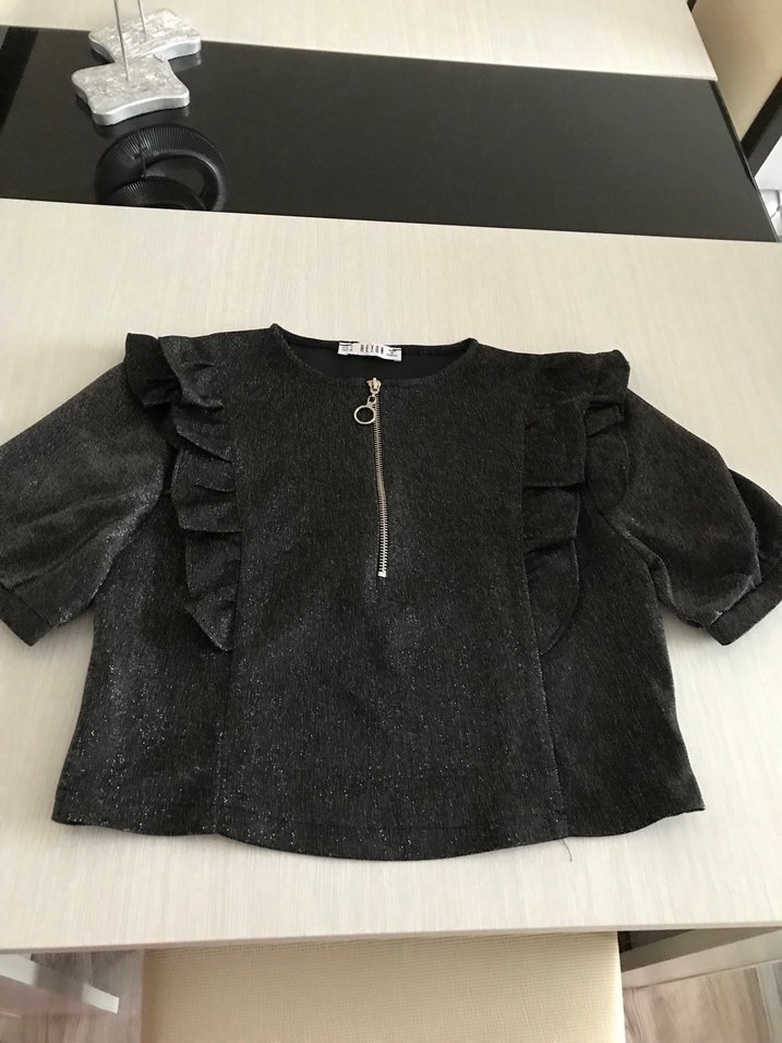 Gri denim kumaştan, uzun kollu, yuvarlak yaka ve önde fırfır detaylı, bol kesim Baskılı gotik tarzda.Birkez giydim S beden