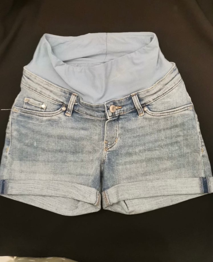 Gri renkte, bol kesim ve kemerli denim hamile mini şort. Yumuşak, esnek bel paneli ile rahat kullanım sağlar.