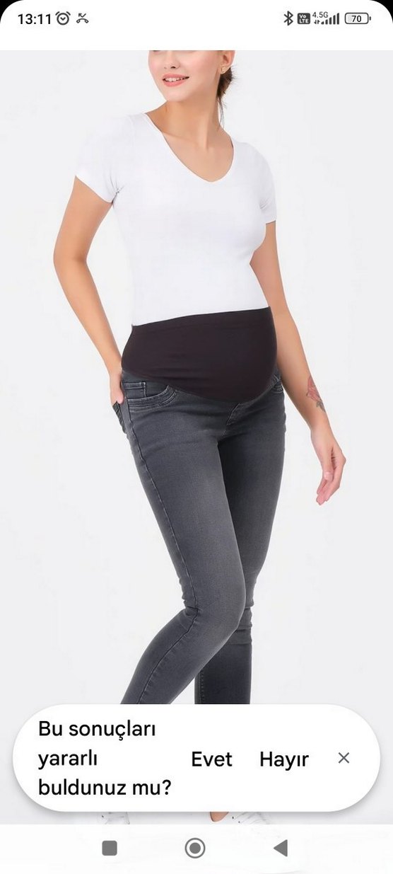 Gri denim hamile pantolonu, kemerli ve rahat kesim. Günlük kullanım için uygun, midi boyda ve konforlu.