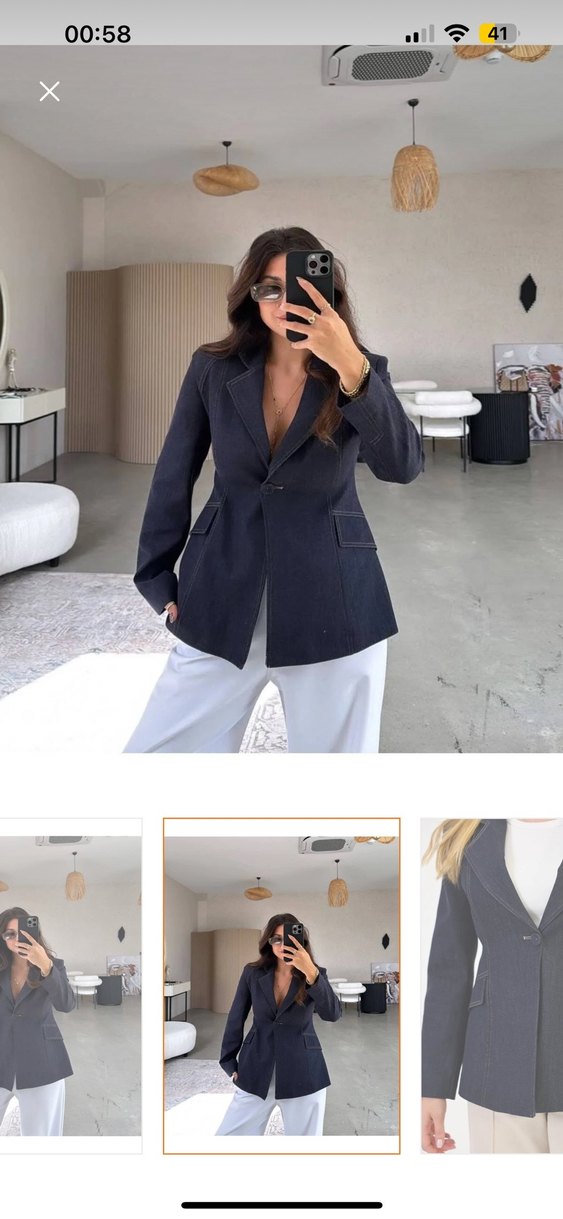 Gri denim kumaştan, normal boy ve regular fit kadın blazer ceket. Notch yakalı ve uzun kollu, iş ortamı ve günlük sokak tarzı için uygun, desen içermeyen şık bir parça.