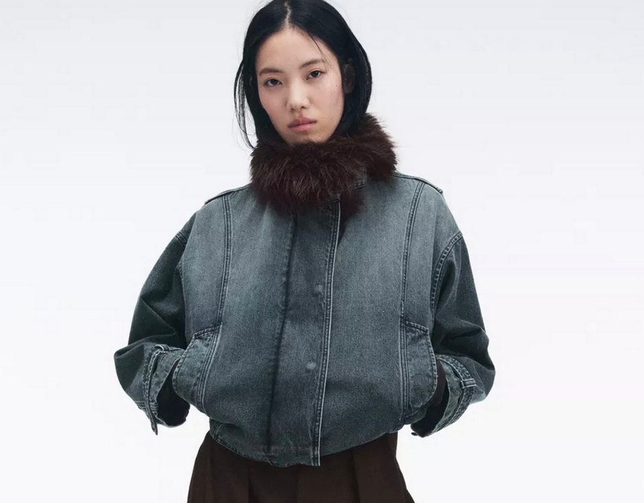 Gri denim kumaştan, kürklü yakalı ve bol kesimli kadın ceket. Uzun kollu, normal boyda, grunge punk tarzında sokak modasına uygun bir parça.