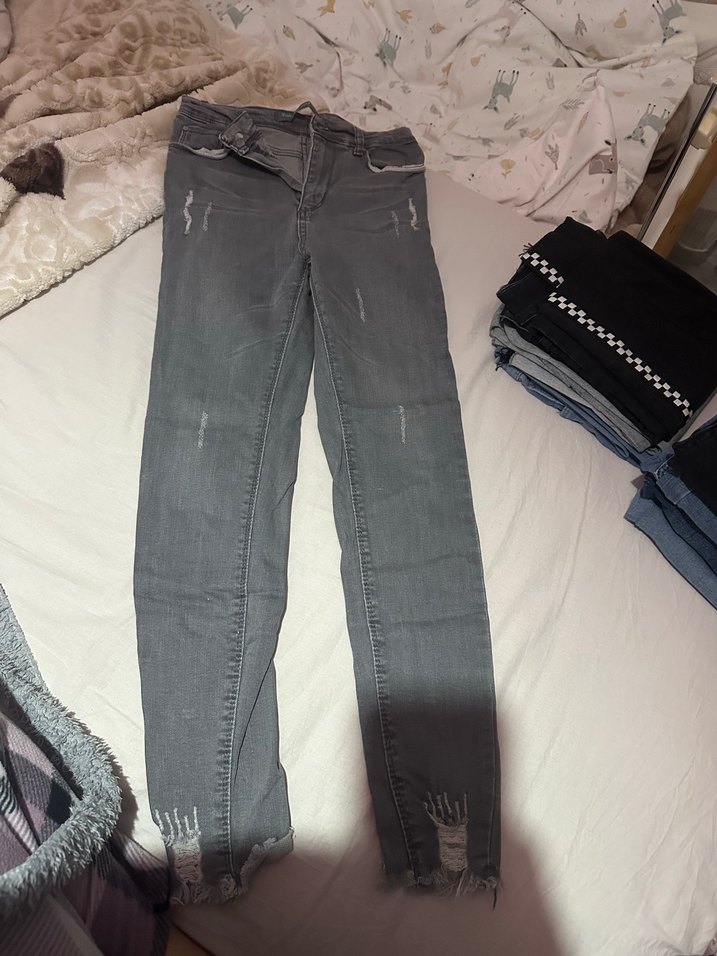 Gri renkte, dar kesim ve midi boyda, kemerli detaylı denim kot pantolon. Günlük rahat kullanıma uygun.