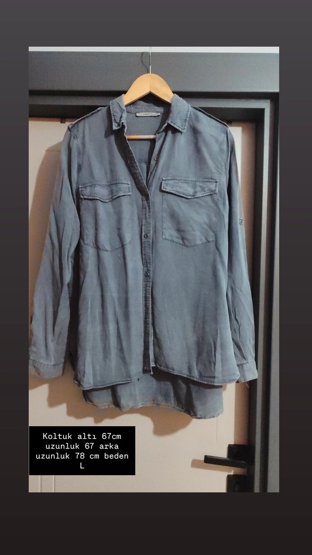 Gri denim kumaştan, uzun kollu ve düğmeli bol kesim kadın gömlek. Midi uzunlukta, 78 cm boyunda ve 67 cm koltuk altı genişliğinde. Günlük kullanıma uygun trend bir parça.