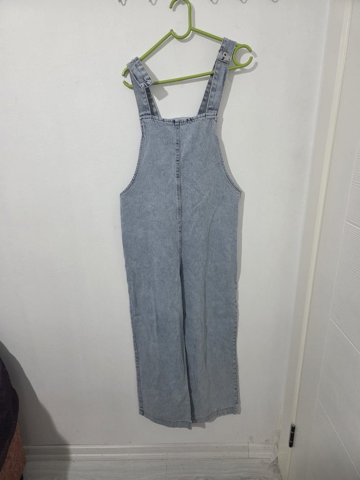 Salaş kesim, gri denim kumaştan, bağlamalı askılı ve batik desenli kadın tulumu, günlük kullanım için rahat ve şık bir sokak stili sunar.