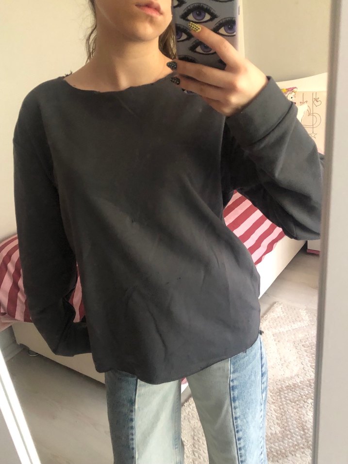 Gri denim kumaştan, yuvarlak yakalı ve uzun kollu, rahat kesim normal boyda gündelik kullanıma uygun sweatshirt. Desensiz, sokak modasına uygun şık tasarım.