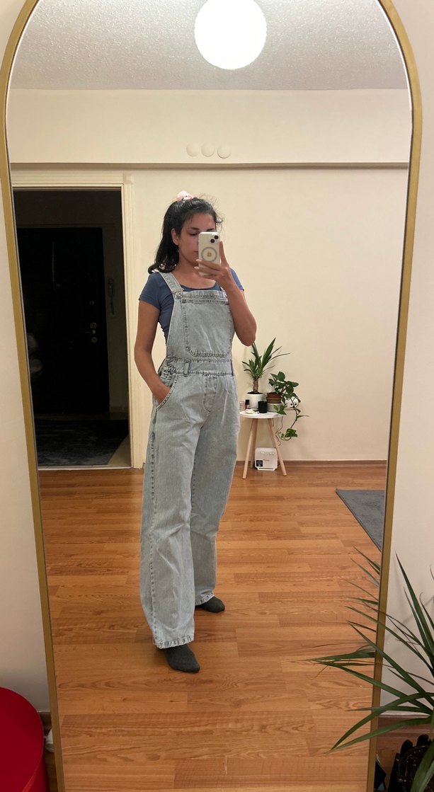 Gri renkli, bağlamalı desenli, askısız ve kolsuz, rahat kesim denim tulum. Günlük kullanım için uygun, zahmetsiz şıklık sunar.