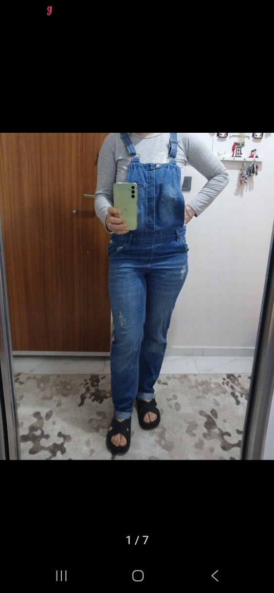 Gri renkte, tokalı ve kolsuz tasarıma sahip, bol kesim kadın denim uzun tulum. Günlük rahat sokak stiline uygundur.
