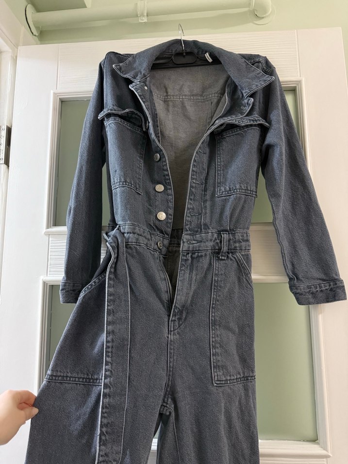 Gri denim kumaştan, uzun kollu ve kemerli bel detayına sahip, gündelik kullanıma uygun, diz altı uzunluğunda, sade tasarımlı kadın tulum.