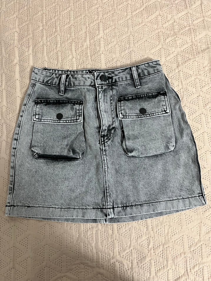 Gri renkli, kemerli ve cepli, fitted kesim denim mini etek, günlük sokak tarzı için uygundur.