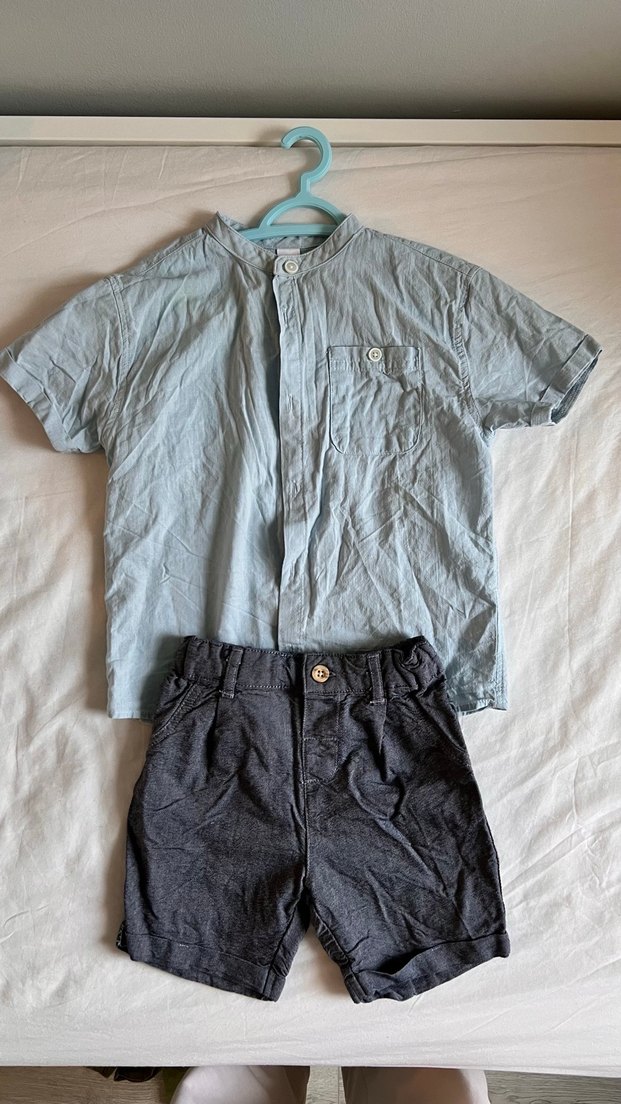 Gri denim kısa kollu, yakalı ve düğmeli gömlek ile koyu gri şorttan oluşan bebek erkek takımı. Sade, normcore tarzda.