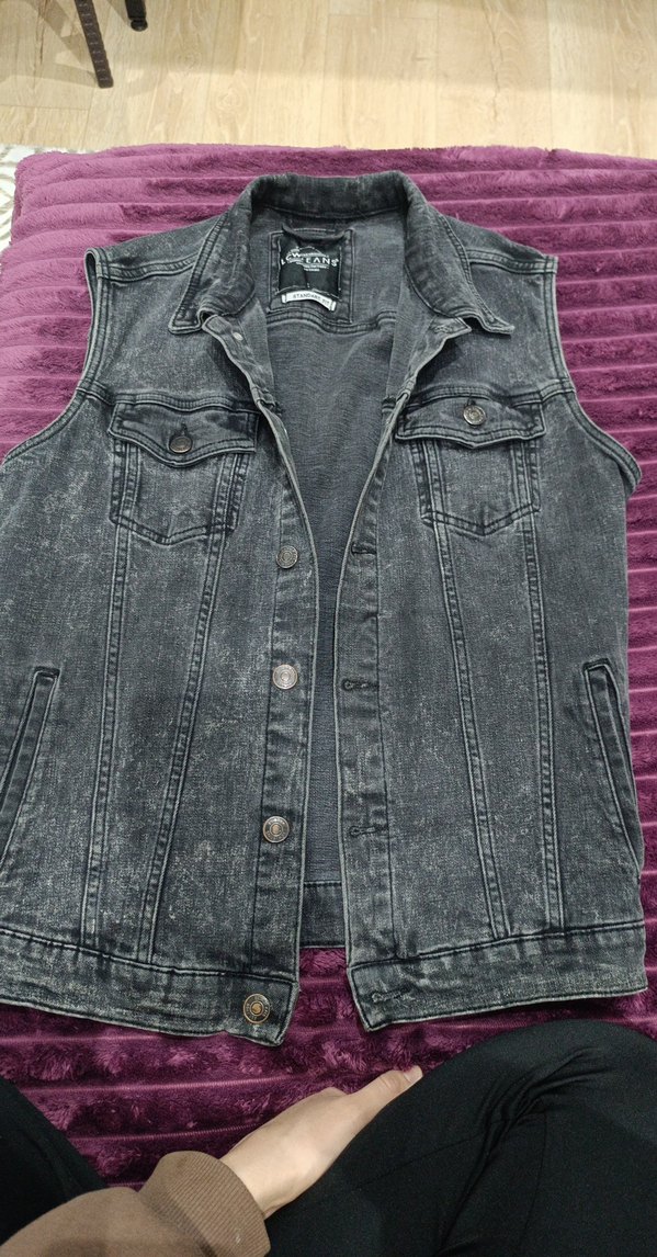 Gri renkte, düğmeli ve klasik yakalı, bol kesim kolsuz denim kadın ceket. Günlük sokak giyimi için uygun.