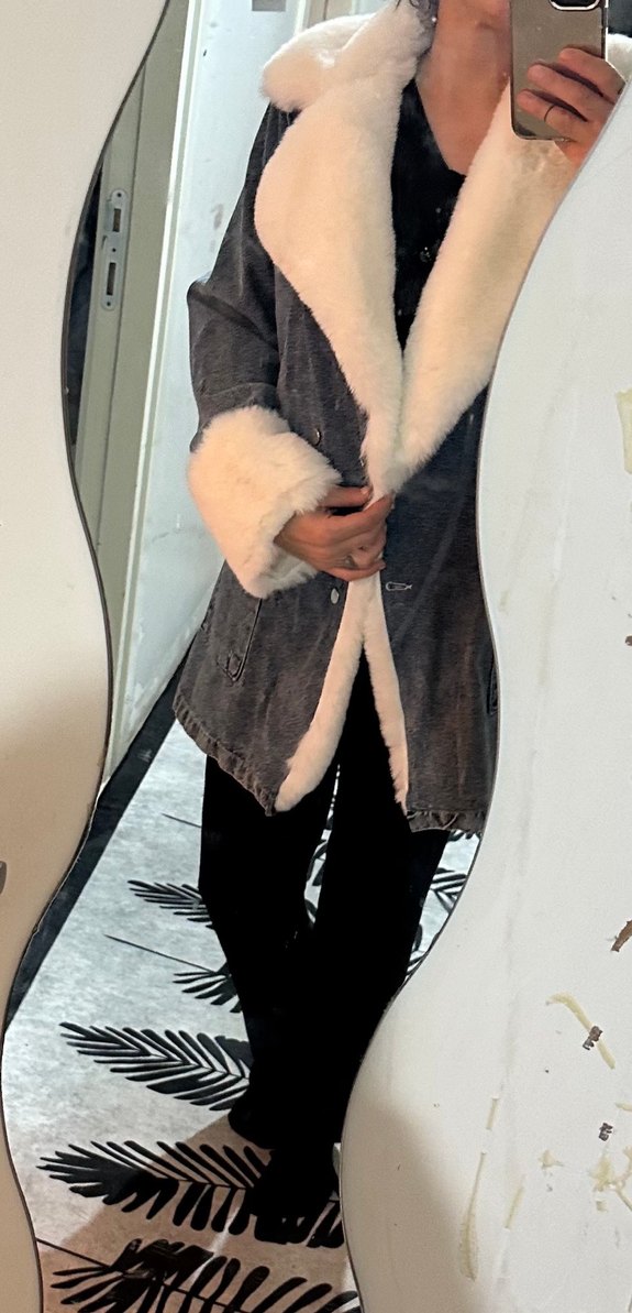Gri denim kumaştan, kürklü yakalı ve manşetli, uzun ve dar kesim hamile kabanı. Trendy ve rahat sokak stili için ideal.