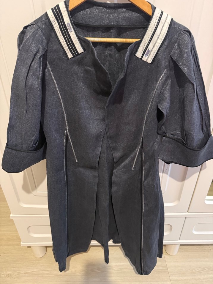 Gri denim kumaştan, kısa kollu, düğmeli ve normal kesim midi uzunluğunda ceket. Notlu yakası ve avant-garde sokak stili detayları bulunur.