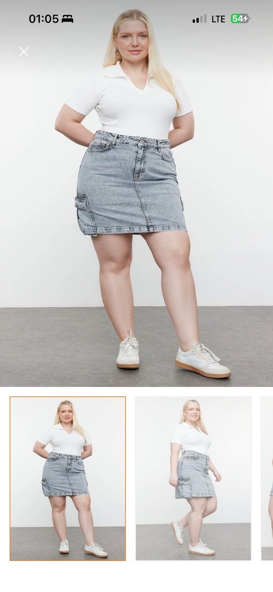 Gri denim midi mini etek, rahat kesimi ve sokak stilini yansıtır, günlük kullanıma uygun rahat ve şık bir parça.