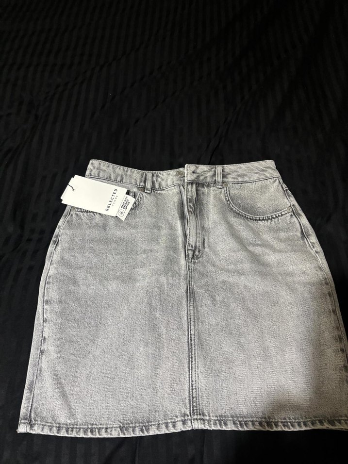 Gri denim mini etek, bol kesim ve sokak stiliyle rahat ve şık, günlük kullanıma uygun.