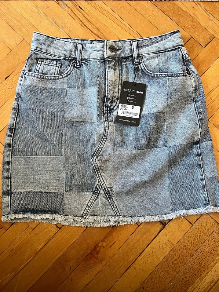 Gri denim mini etek, ekose desenli ve belde tokalıdır. Normal boyda, sokak stiline uygun, günlük kullanıma uygundur. S beden