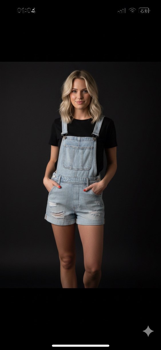 Ön cepli ve yırtık detaylı, bol kesim gri denim mini kadın salopet, rahat sokak stili için uygun. ✨