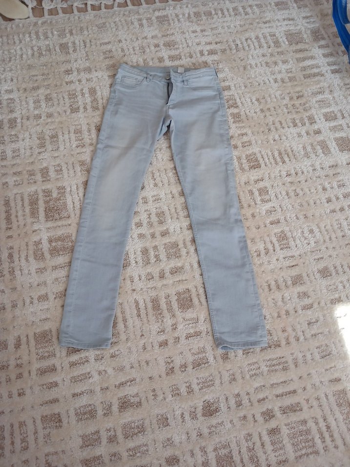 Gri renkte, regular fit ve normal boyda denim pantolon. Desensiz ve sade tasarımıyla günlük kullanıma uygun, rahat ve şık bir tercih. bir yada iki kez kullanılmış kusursuz likralı.13 yaşa uygun.boy 95 cm.bel 35 cm.açık mavi renk