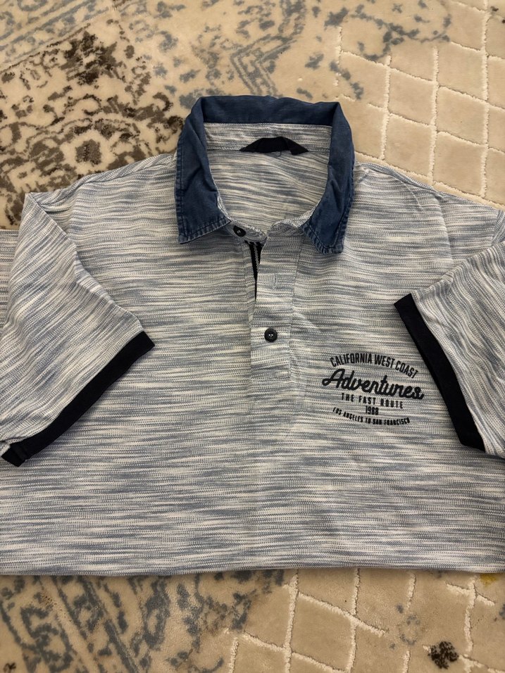 Gri renkte, kısa kollu, düğmeli denim yakalı ve baskılı detaylara sahip erkek polo tişört. Rahat kesimi günlük kullanıma uygundur. M beden kusuru yok markasını hatırlamıyorum ama markaydı etiketi silinmiş